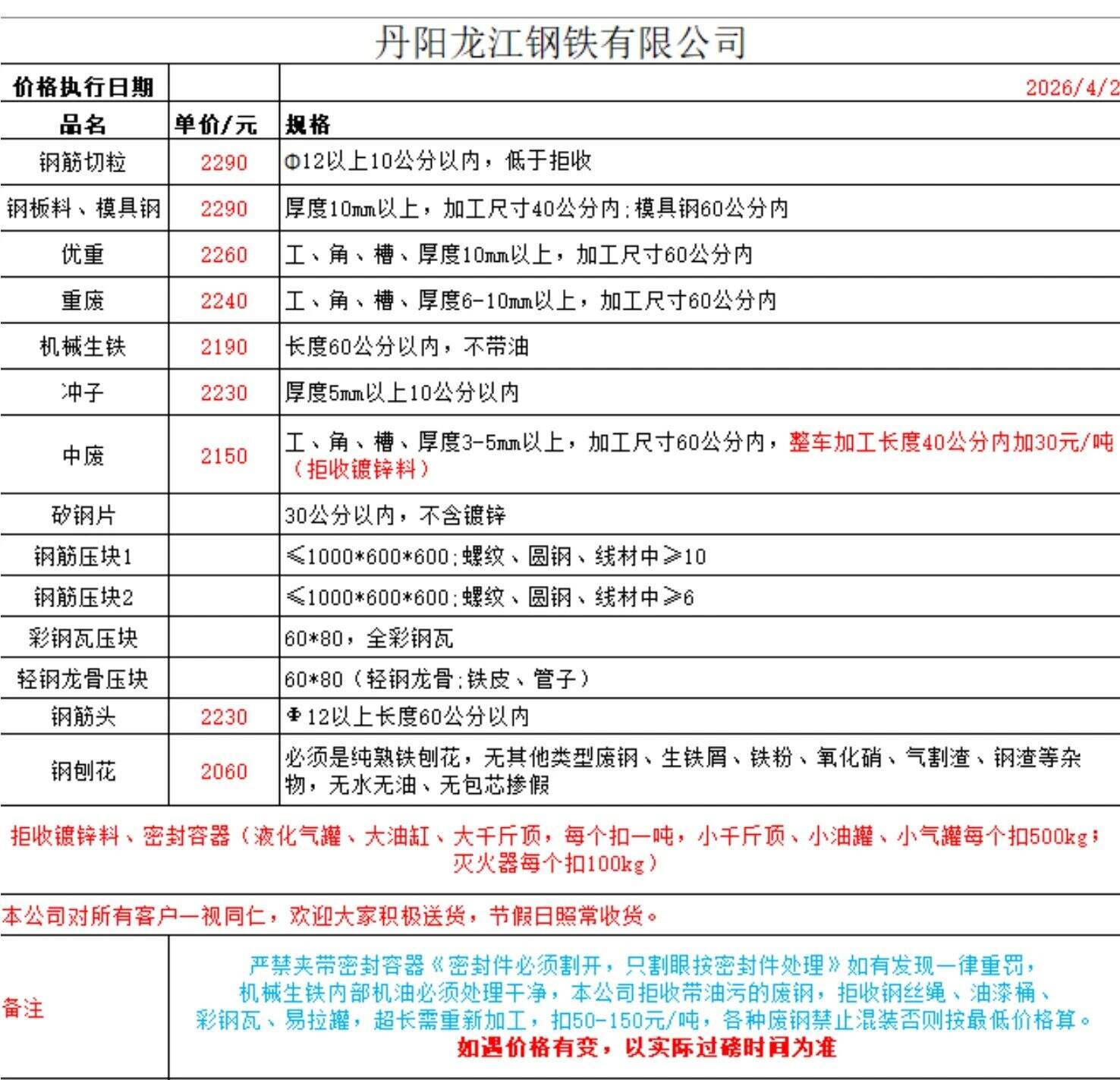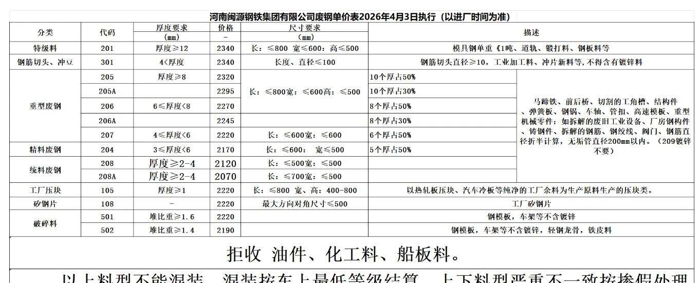 江西萍钢各废钢供货商:从*月*日起,散料废钢、钢筋压块、脚手架管压块、破碎料、一类压块、二类压块、二类压块(小块)、三类压块、四类压块下调**元/吨,五类压块下调**元/吨,其他品种不变。收到请回复。