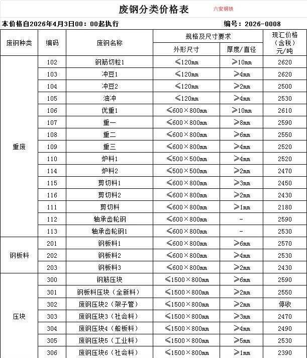 **日安徽力鑫特钢跌**:重废****-****,剪料****-****,刨花****-****具体参考报价单,不含税。
