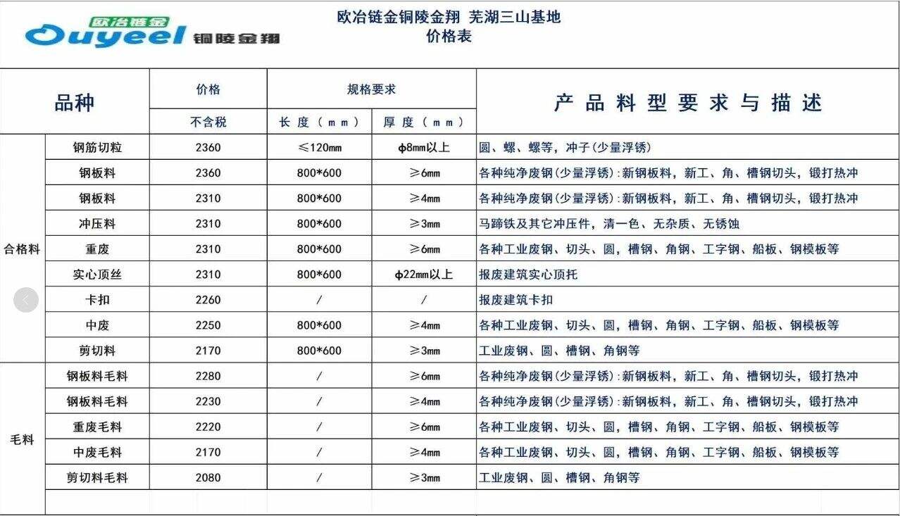 二:≥**mm优质重废****;≥*mm重废****,≥*mm重废****,≥*mm中废****,≥*mm纯剪料****,以上品种合格料型➕**(需汽割价格表减**~***元);