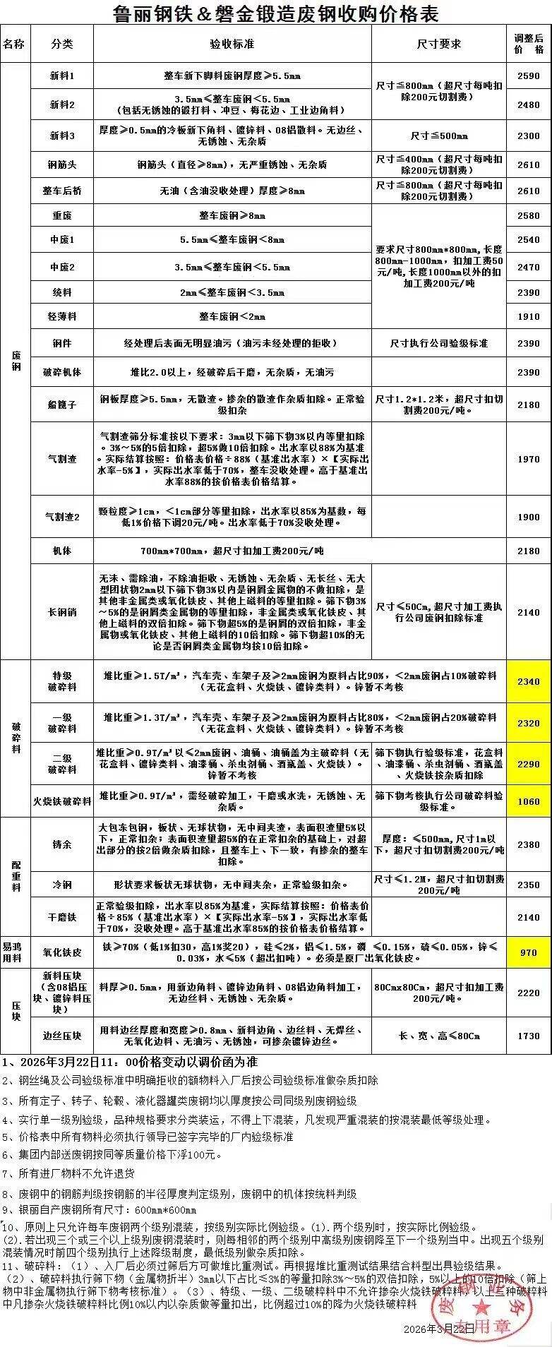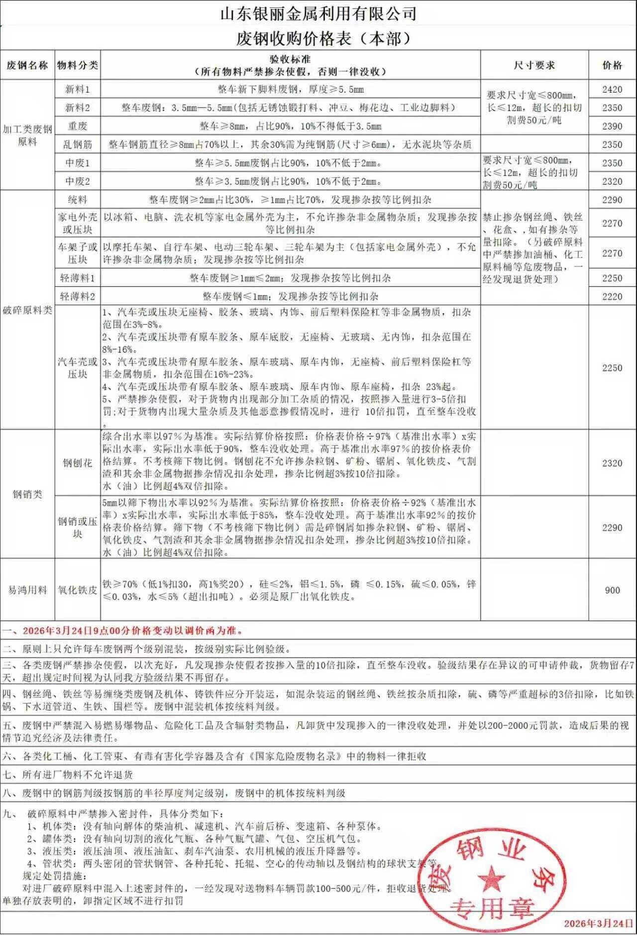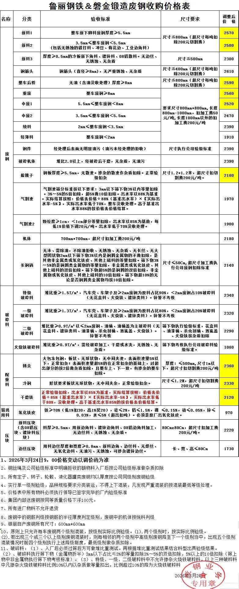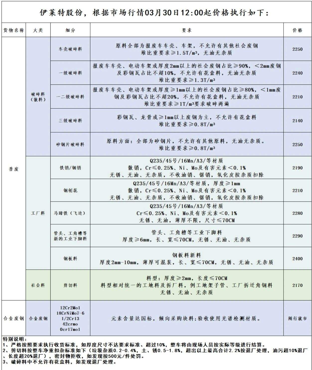 潍坊特钢废钢价格做出如下调整:*%增值税专用发票----重型废钢:****元/吨,特级废钢:****元/吨,中级废钢:****元/吨**%增值税专用发票---重型废钢:****元/吨,特级废钢:****元/吨,中级废钢:****元/吨废钢个人户----------重型废钢:****元/吨,特级废钢:****元/吨,中级废钢:****元/吨以上规格及价格自****年*月**日上午*点开始执行。