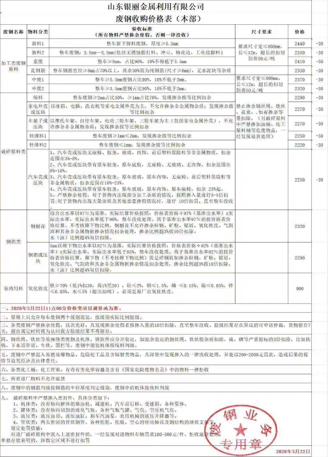 山东银丽:****年*月**日*点**分,新料*、重废、中废*价格下调**元/吨。其余种类不做调整。请注意查收!