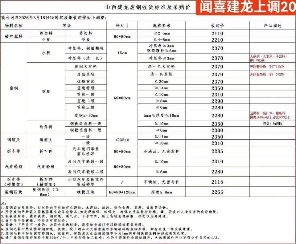 *日山西铭福废钢涨**。特级重废停收,一级重废****,二级重废****,一级中废****,二级中废****。三级中废****,钢件****钢筋头一级停收,钢筋头二级停收,钢筋压块停收