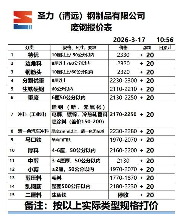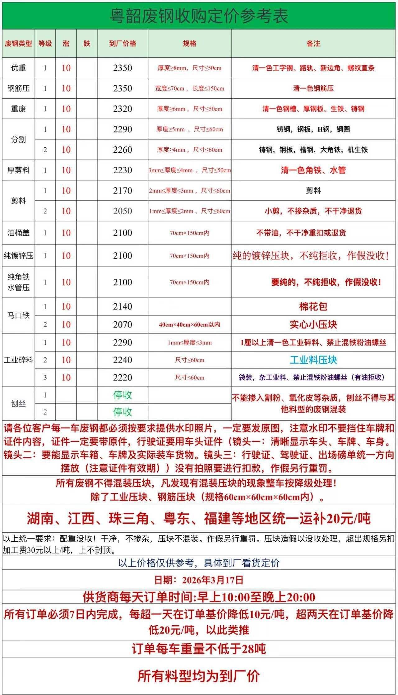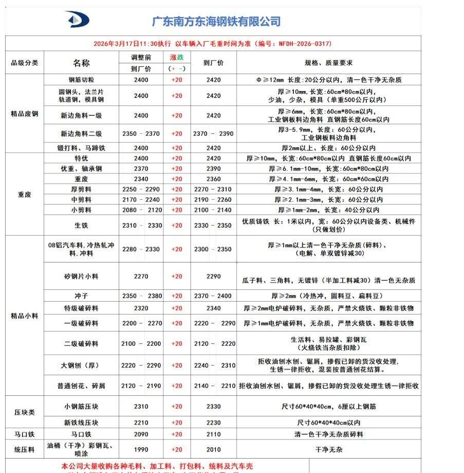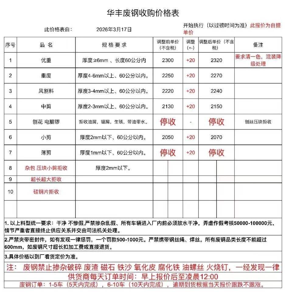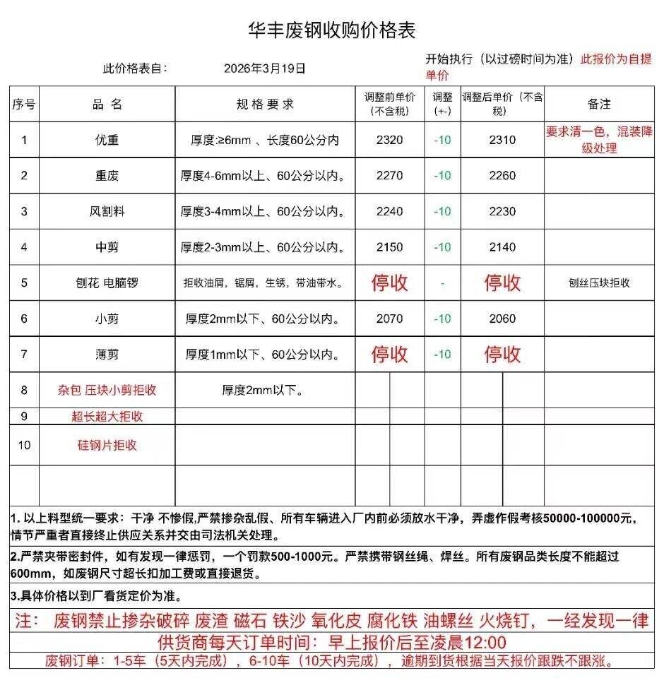 破碎料停收,重废毛料停收。含税价。