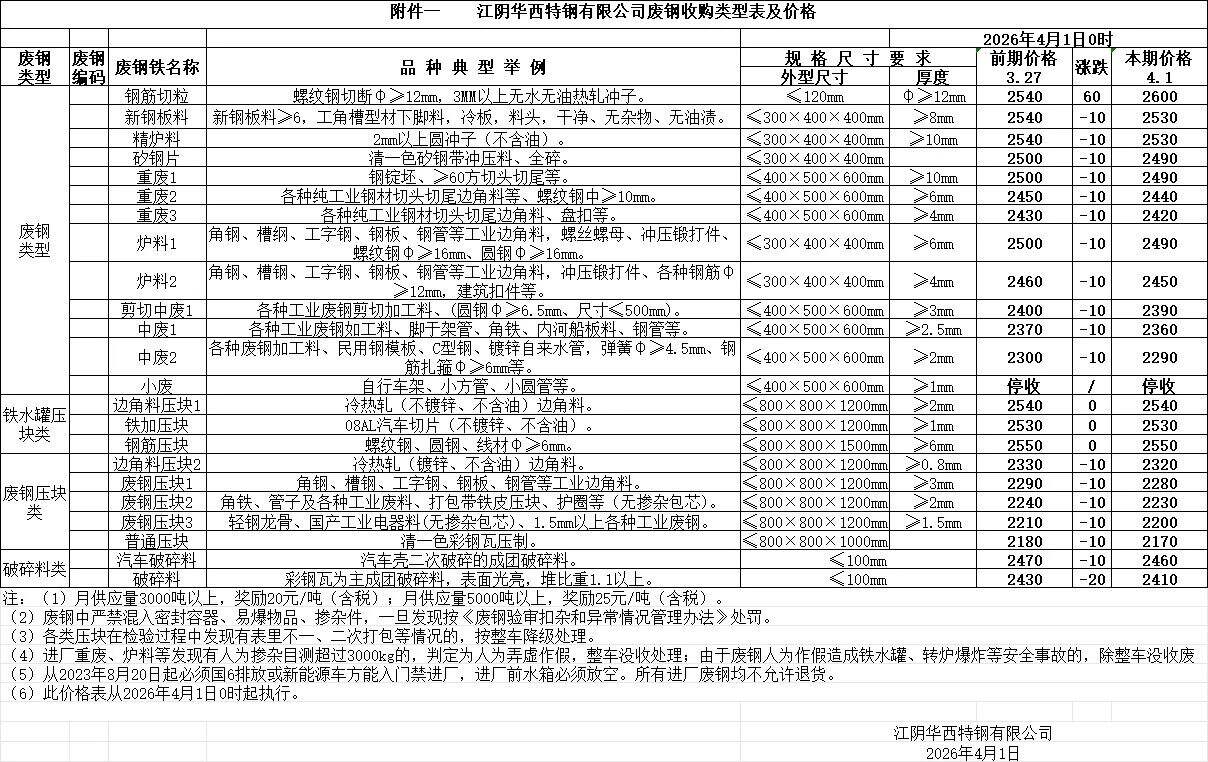 常州中天****年*月**日零点起,钢筋切头、剪废轻废、矽钢片、刨花下调**元/吨,粉碎料、精炼粉碎料下调**元/吨,砂钢片、炉料重废下调**元/吨,其余品种不变,以公布价格表为准。