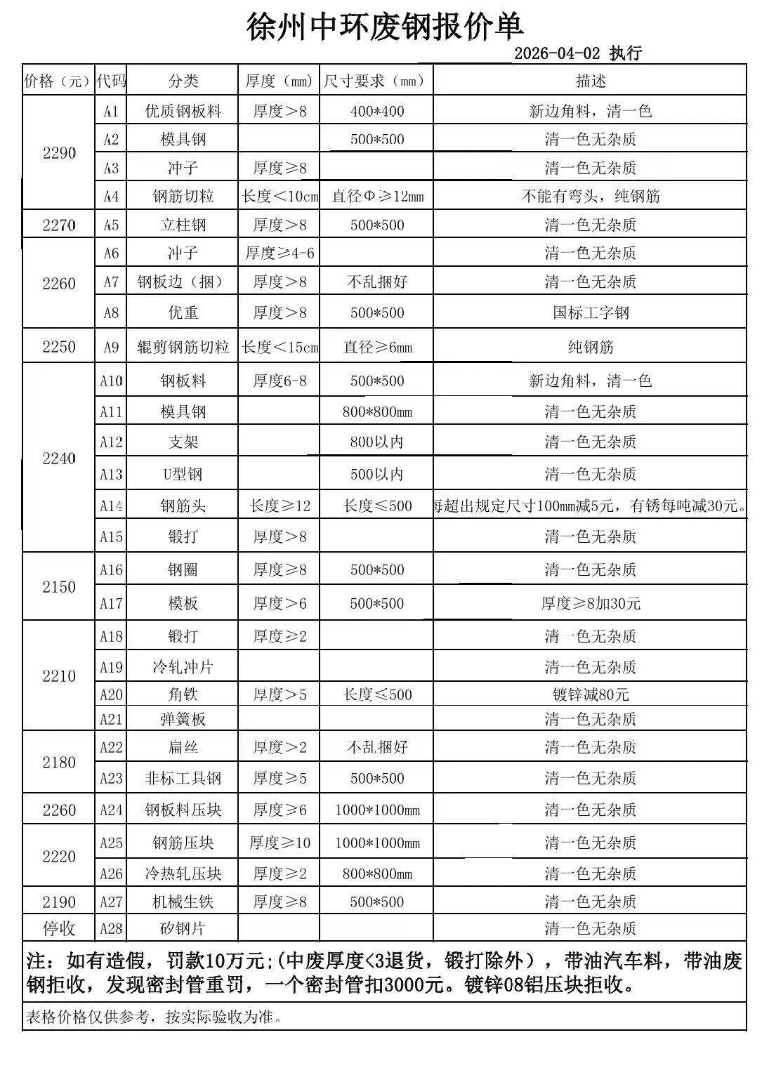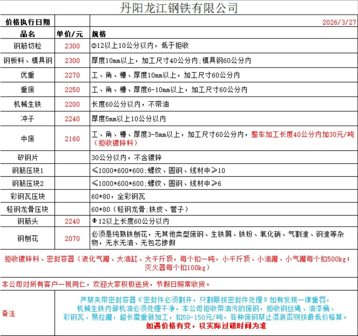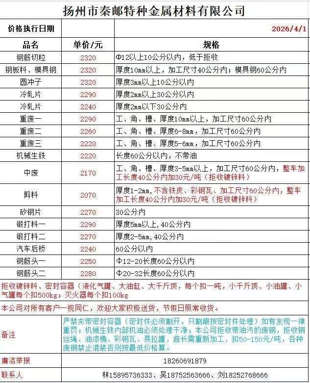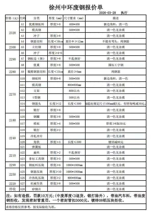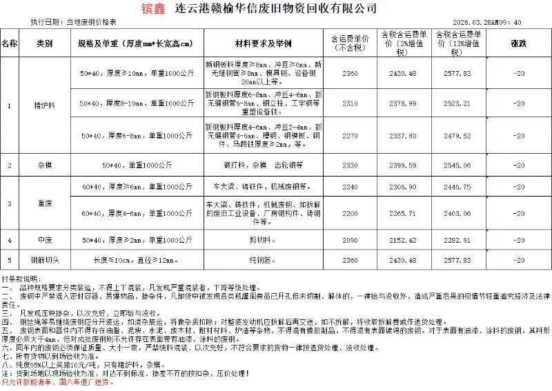 连云港亚新通知:*月**日**:**废钢价格下调**元/吨:一、**毫米厚新钢板料,模具钢,价****元;二、*毫米厚度以上锻打毛边,价****-****元;三、重废A,价****元;四、*毫米厚重废B,价****元;五、*毫米厚中废新料,价****-****元。*毫米厚度以下拒收,车面与车底等级不一,按掺假处理。规格:**X**。超长度需重新加工:(*)占**%以上扣**元/吨(*)占**%以上扣***元/吨(*)化工厂料,带油料,高硫废钢,油漆桶废钢一律拒收。所有密封容器(如:千斤顶,汽车液压顶,各类气瓶,罐,密封管件等),必须彻底切断处理,如未彻底切断,重罚*****元以上/件。