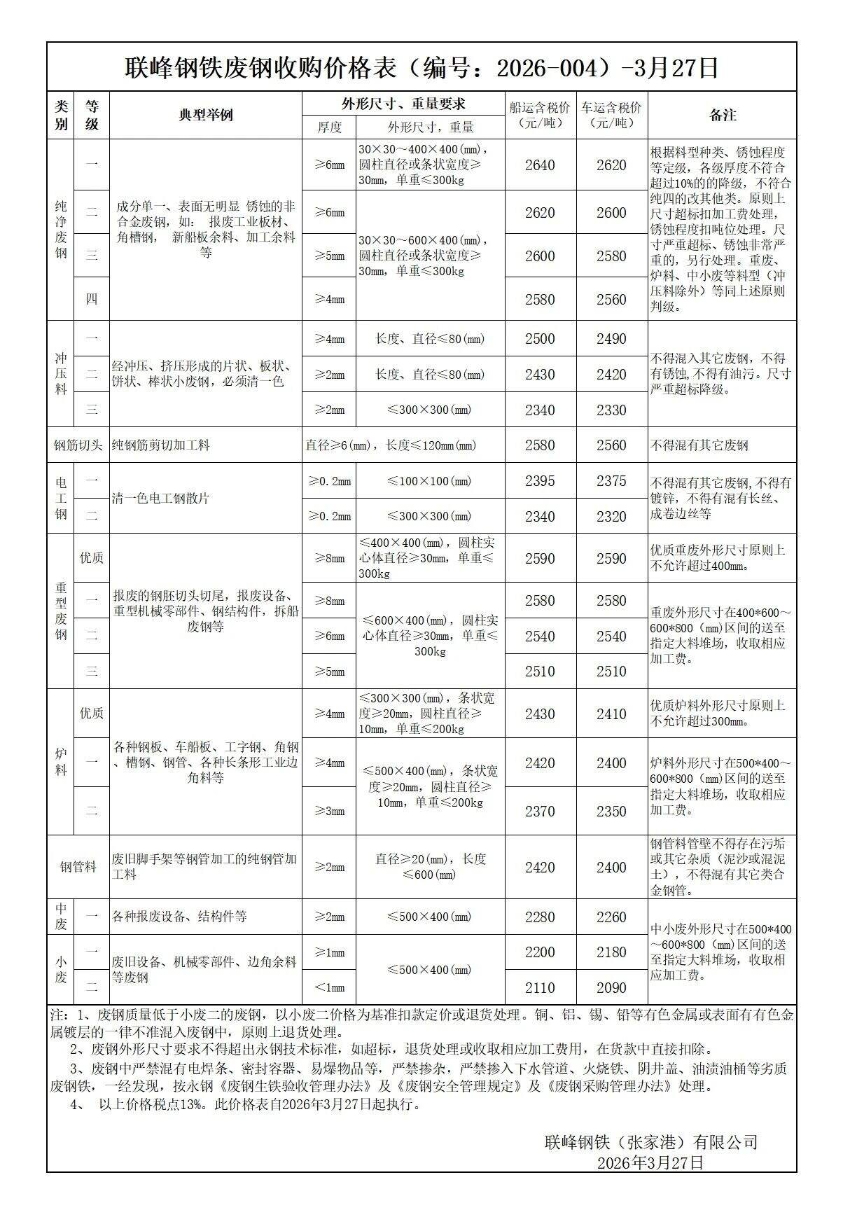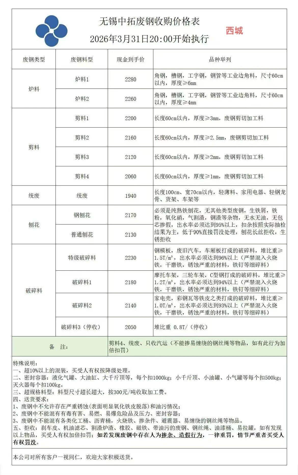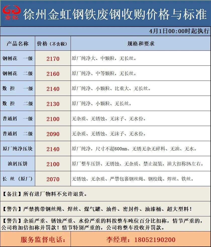连云港亚新通知:*月**日**:**废钢价格下调**元/吨:一、**毫米厚新钢板料,模具钢,价****元;二、*毫米厚度以上锻打毛边,价****-****元;三、重废A,价****元;四、*毫米厚重废B,价****元;五、*毫米厚中废新料,价****-****元。*毫米厚度以下拒收,车面与车底等级不一,按掺假处理。规格:**X**。超长度需重新加工:(*)占**%以上扣**元/吨(*)占**%以上扣***元/吨(*)化工厂料,带油料,高硫废钢,油漆桶废钢一律拒收。所有密封容器(如:千斤顶,汽车液压顶,各类气瓶,罐,密封管件等),必须彻底切断处理,如未彻底切断,重罚*****元以上/件。