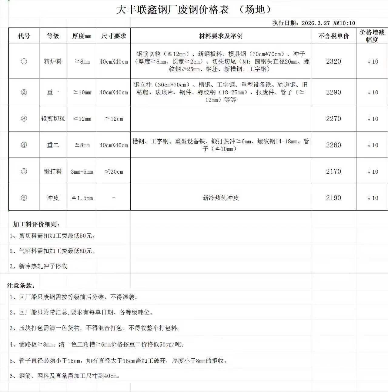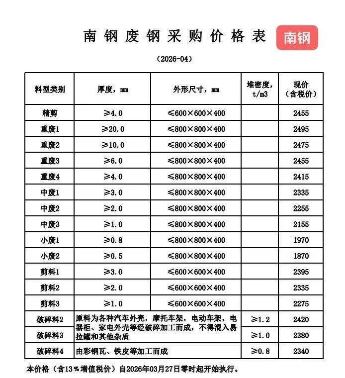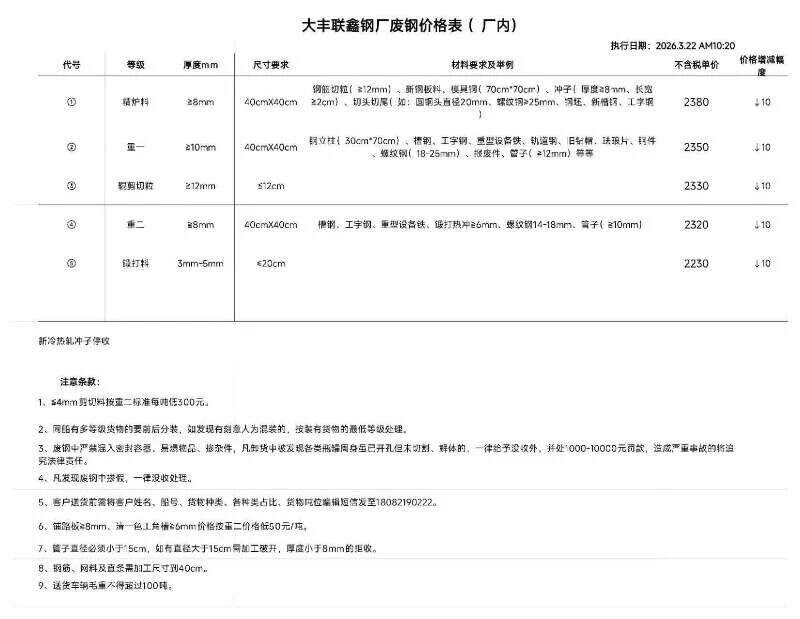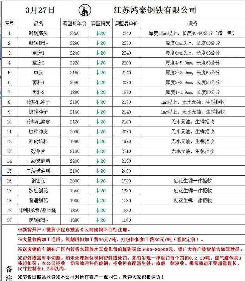 江苏敬业基地计划于****年*月**日**时起含税价格:废钢统一下调**元/吨。钢板料(*mm)****元/吨,重废一(**mm)****元/吨,重废二(*mm)****元/吨,重废三(*mm)****元/吨,次重废(*mm)****元/吨,特级破碎料*类****元/吨。