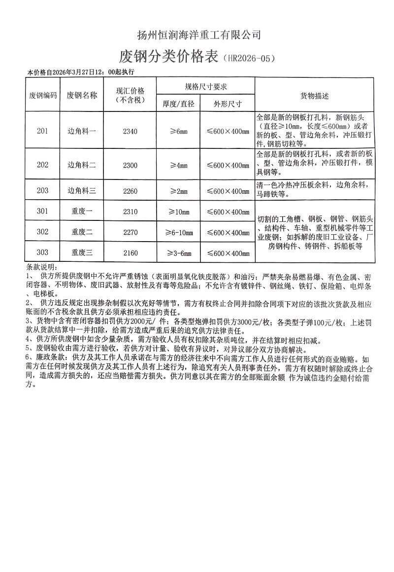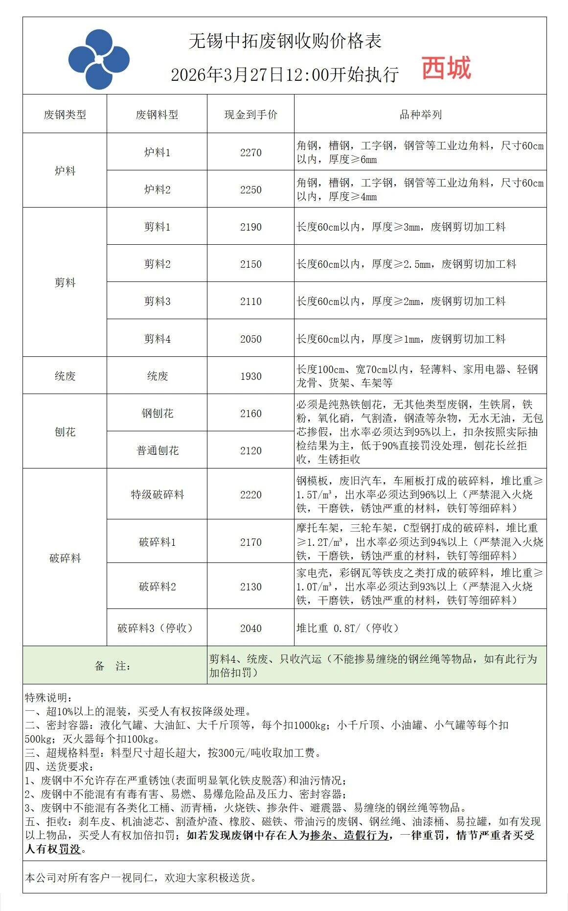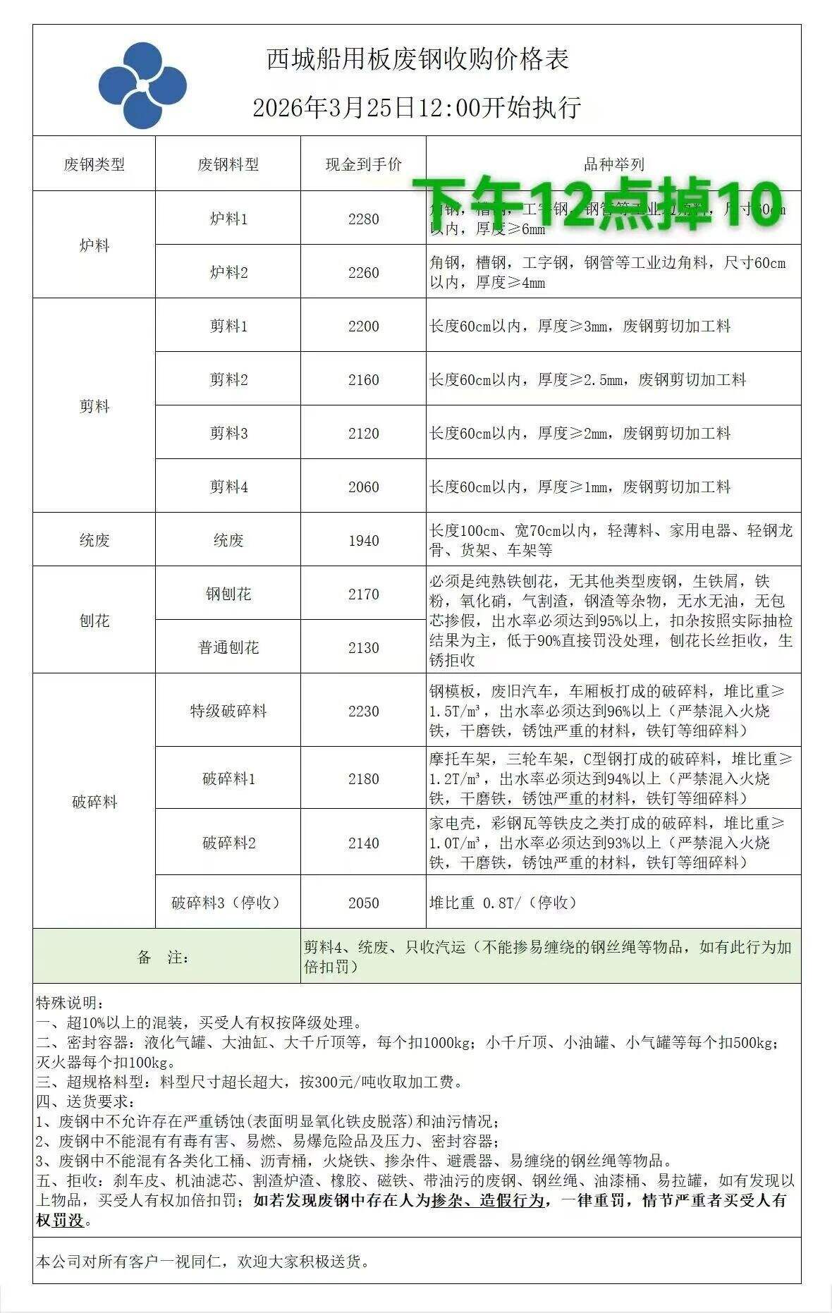 江苏敬业基地计划于****年*月**日**时起含税价格:废钢统一下调**元/吨。钢板料(*mm)****元/吨,重废一(**mm)****元/吨,重废二(*mm)****元/吨,重废三(*mm)****元/吨,次重废(*mm)****元/吨,特级破碎料*类****元/吨。