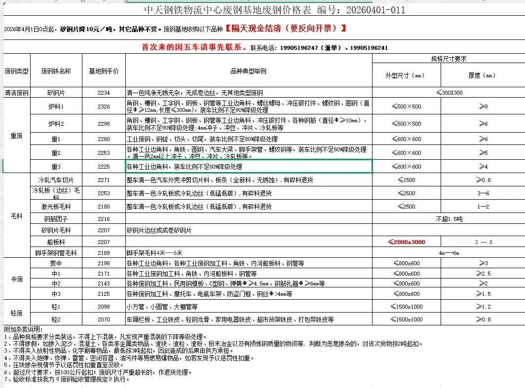 南通九圩港天泽码头现款收:*以上新钢板炉料****、毛料****-****;重废、工角槽****-****;**上直钢筋****;桥梁模板、拆船毛料****-****左右;*以上激光板****;彩钢瓦****-****;气割料、大件生熟铁看货定价。密封容器.含油废钢拒收。可带票,价格另议。联系电话*********** 入场人员请佩戴安全帽!