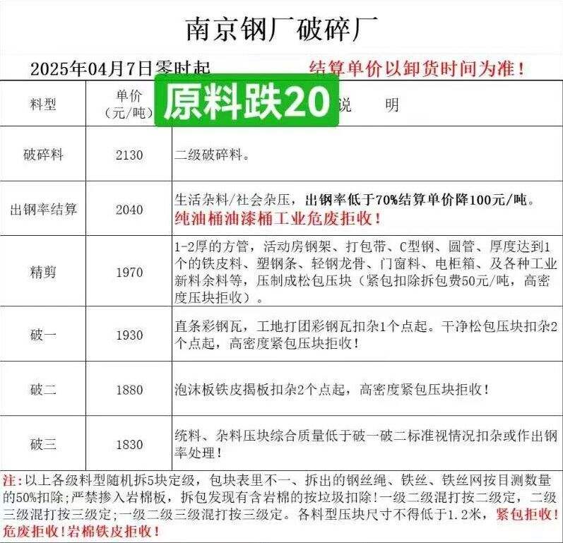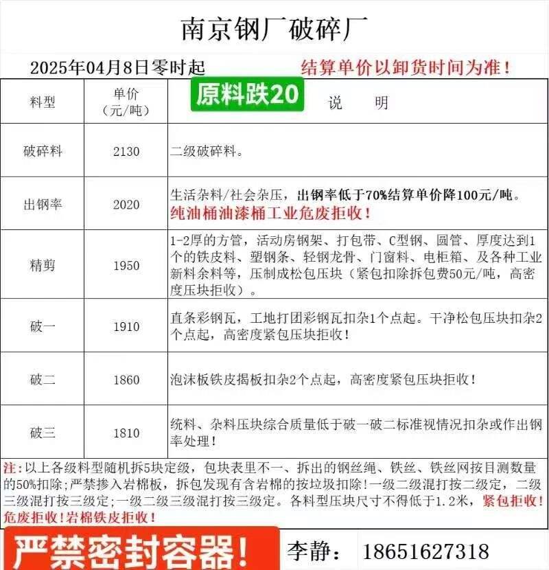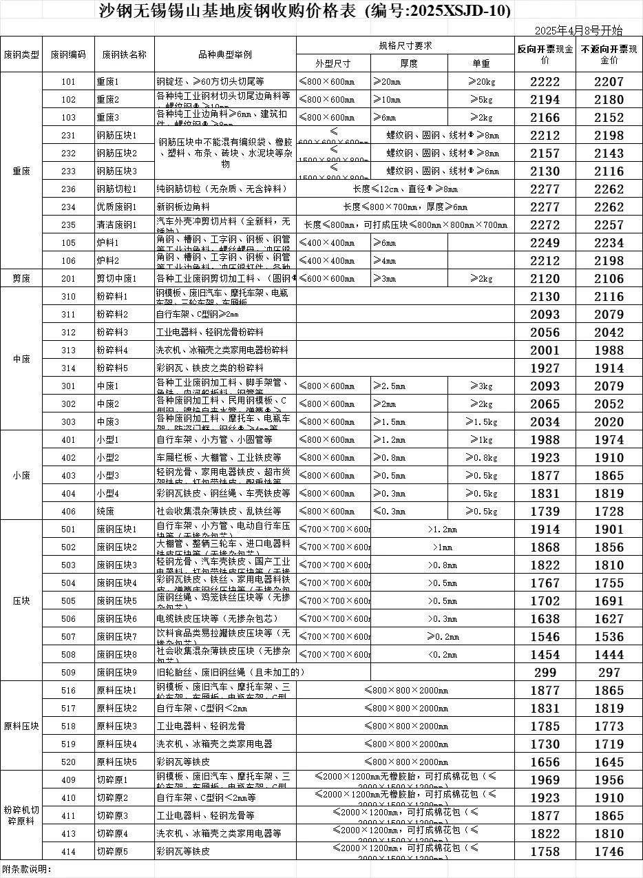 价格表更新!沙钢无锡锡山基地自****年*月*日起含税价格下调**-**元/吨,具体废钢价格以基地价格表为准。
