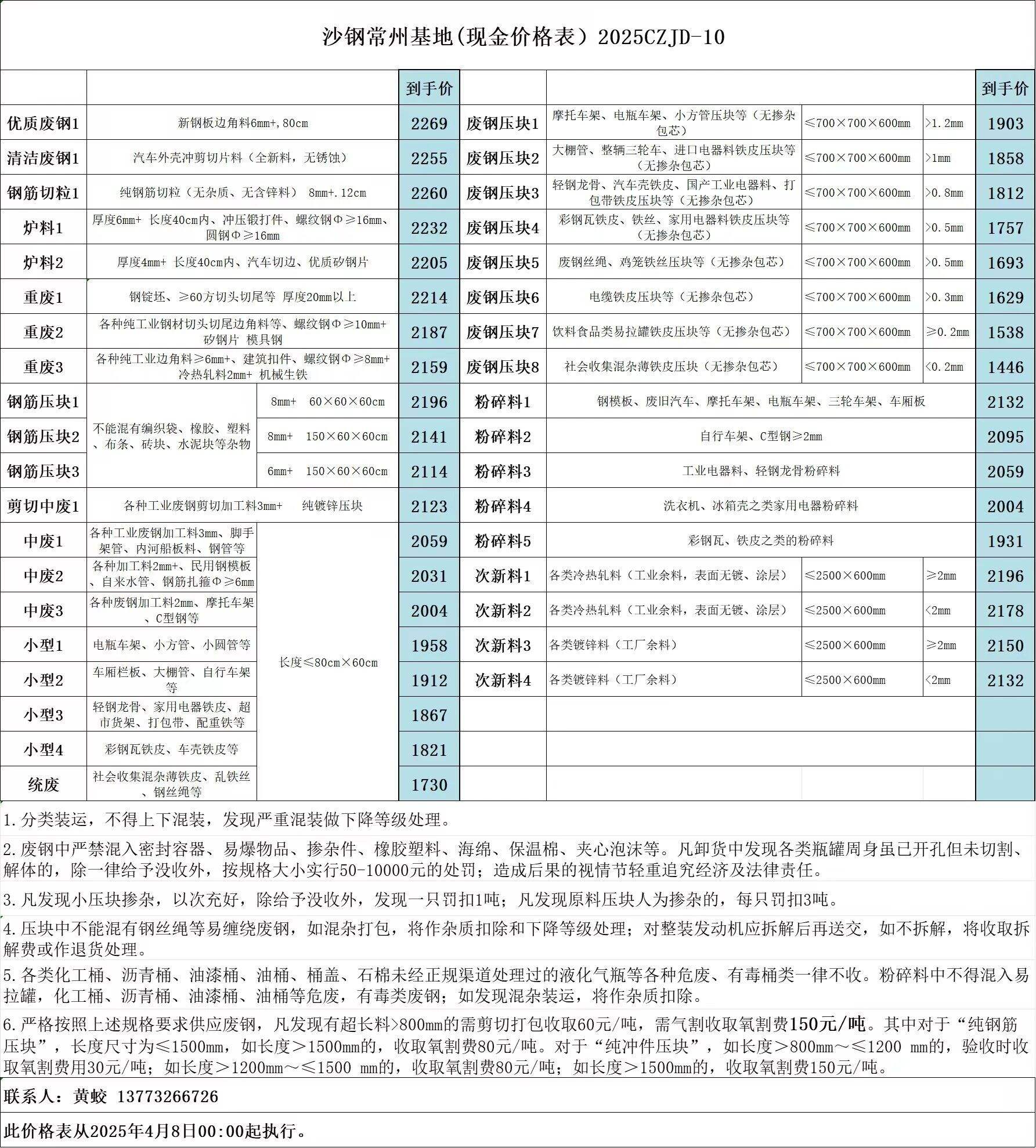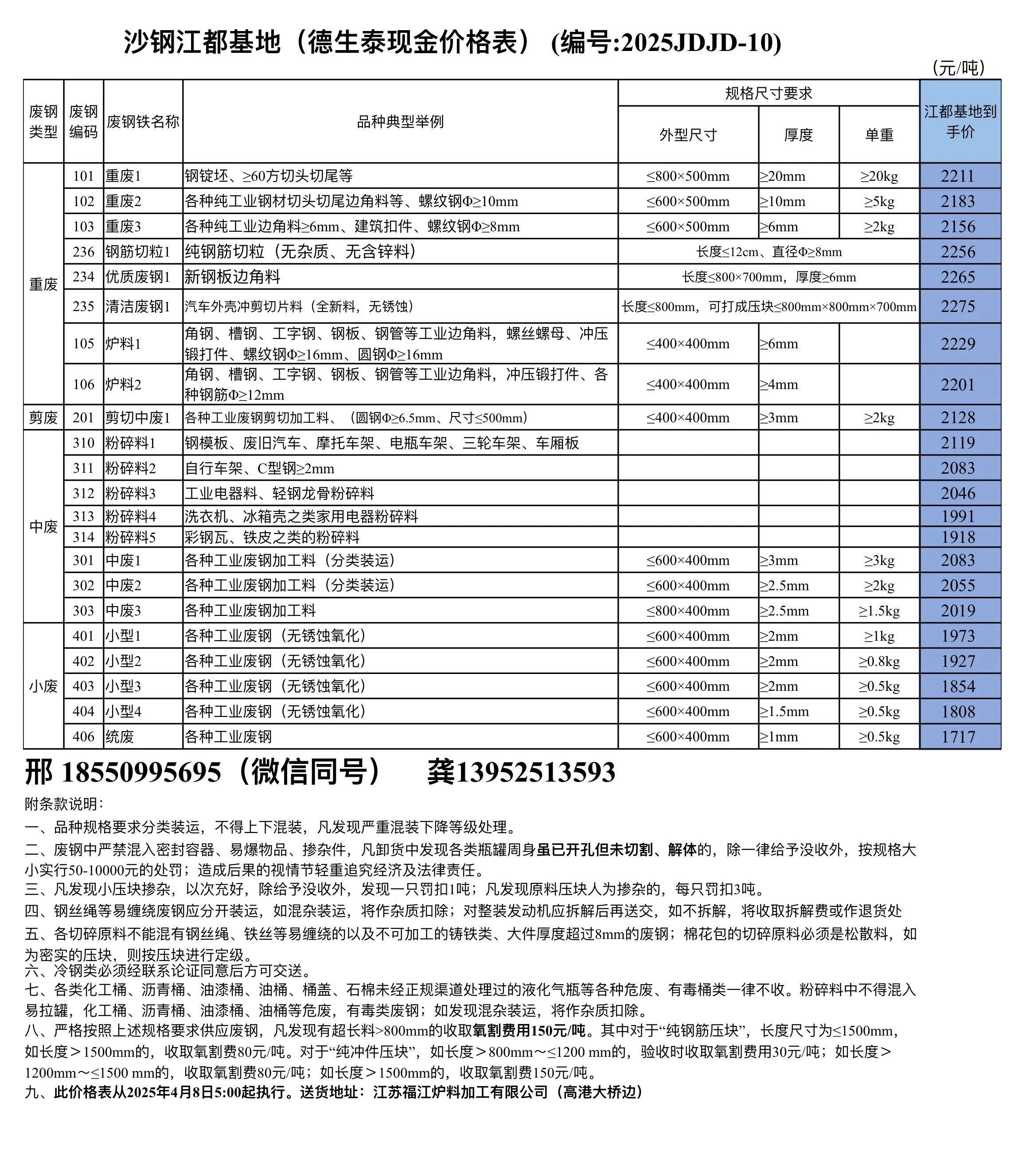 价格表更新!沙钢江都基地自****年*月*日早*点起废钢含税价格下调**元/吨-**元/吨,具体废钢价格以基地价格表为准。