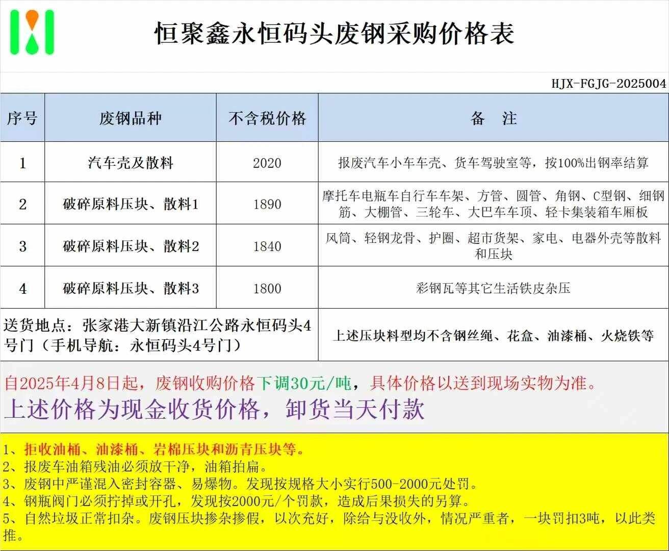 自****年*月*日起,张家港永恒码头废钢采购价格下调 **元/吨。具体以送到现场实物为准,详见最新价格表。送货联系王经理,电话***********。