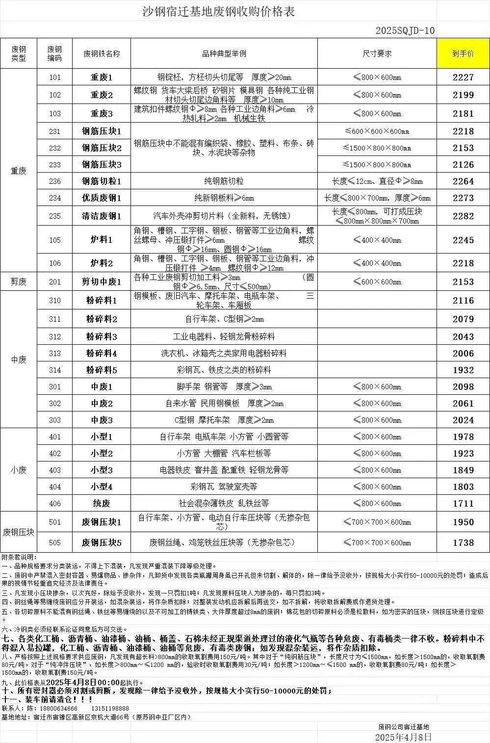 价格表更新!沙钢宿迁基地自****年*月*日早*点起废钢含税价格下调**-**元/吨,具体废钢价格以基地价格表为准。