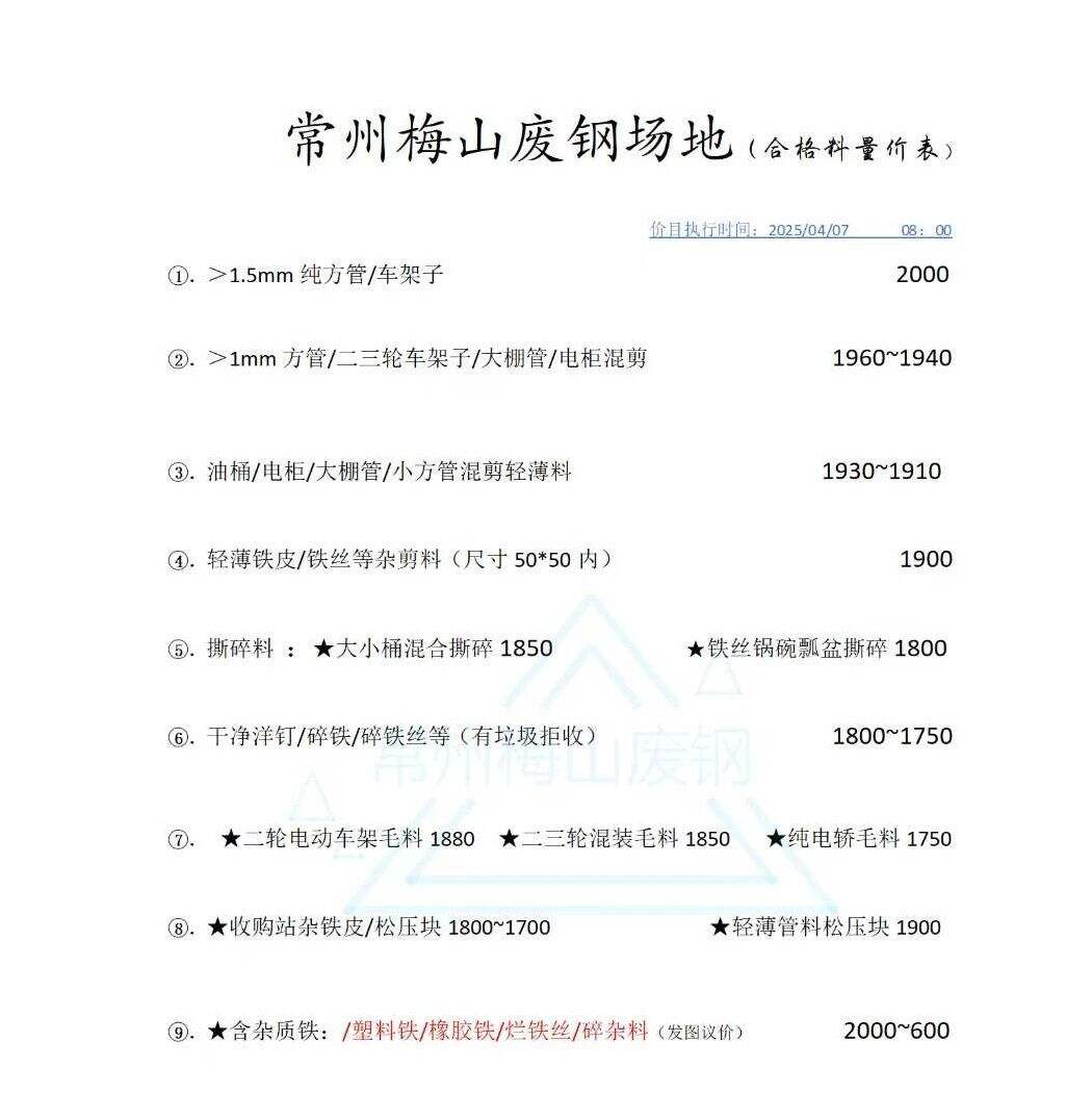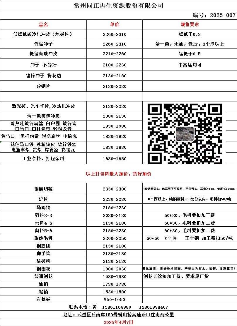 ****年*月*日常州同正再生资源股份有限公司废钢价格整体调整,具体请见价格表