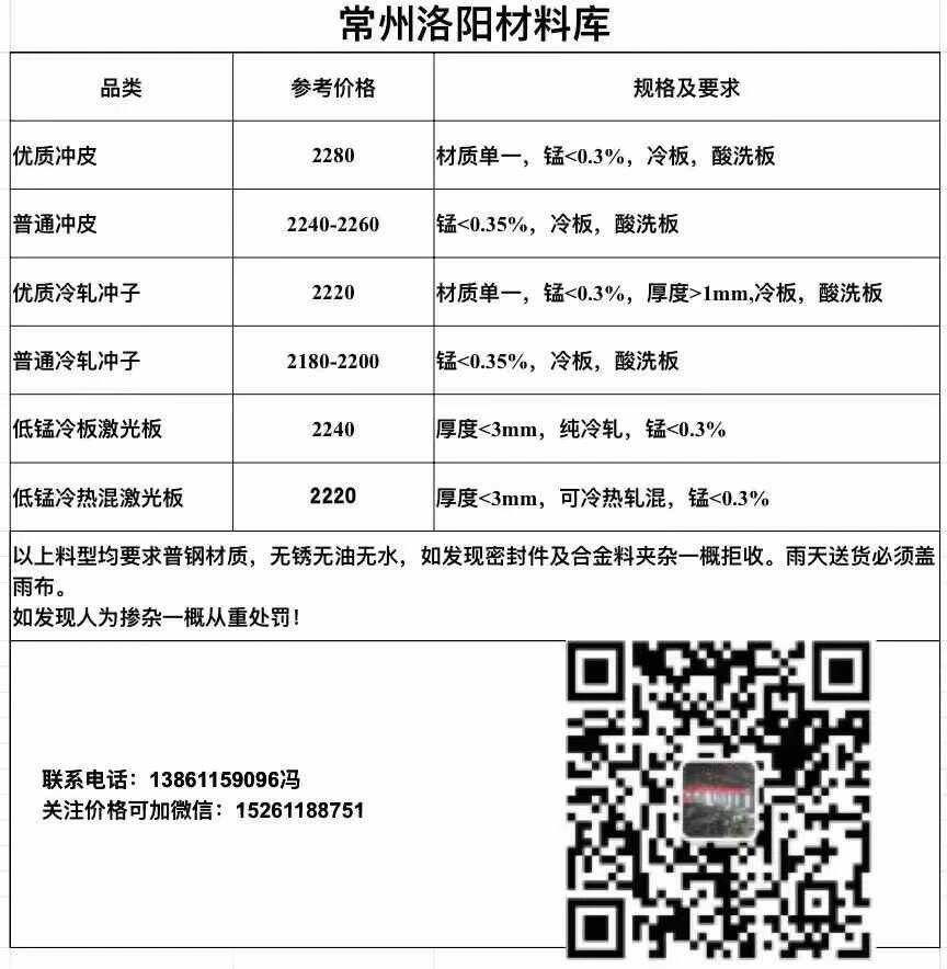 江苏常州洛阳材料库高价收购、自提冷板冲皮,钢板料。收购价:优质冷板酸洗冲条冲皮最高****,普通低锰冷板酸洗冲条冲皮****-****,低碳低锰冲子****-****,纯低锰冷板激光板****,低锰冷热混激光板****,联系电话***********冯,关注最新价格请加微信:***********。地址:江苏常州武进洛阳镇创盛路*号