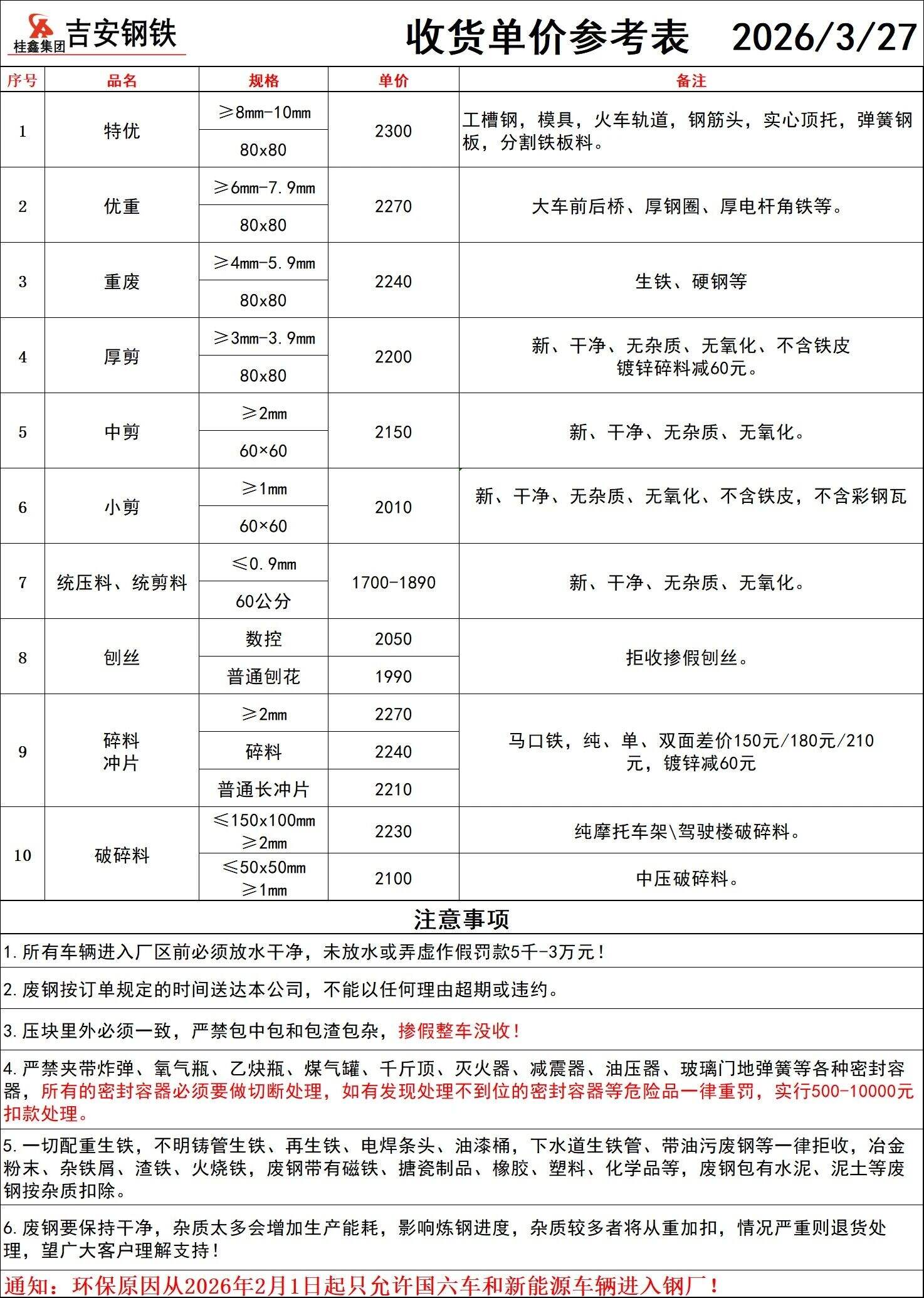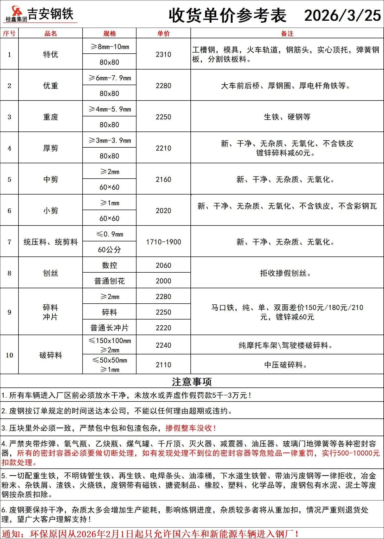 * 重废 规格:厚度≥*.*-*mm,长度≤**-**cm 单价:**** 备注:掺低规格料按降级处理