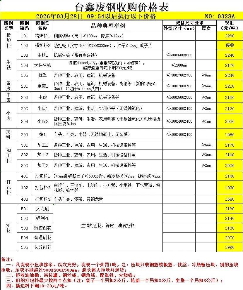 方大特钢废钢自****年*月*起:钢筋压块下调**元/吨,边角料压块*下调**元/吨,A级社会压块下调**元/吨,A*级社会压块下调**元/吨,普通压块下调**元/吨,B级社会压块下调**元/吨,汽车轮胎丝下调**元/吨,一级废钢压块下调**元/吨,二级废钢压块下调**元/吨,其他料型不变。