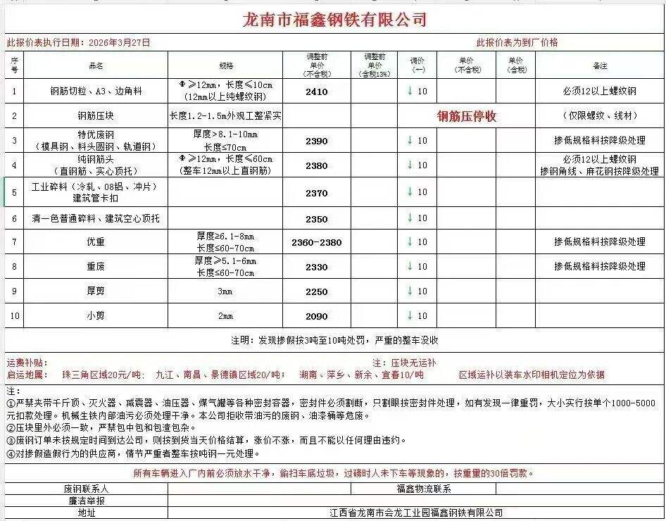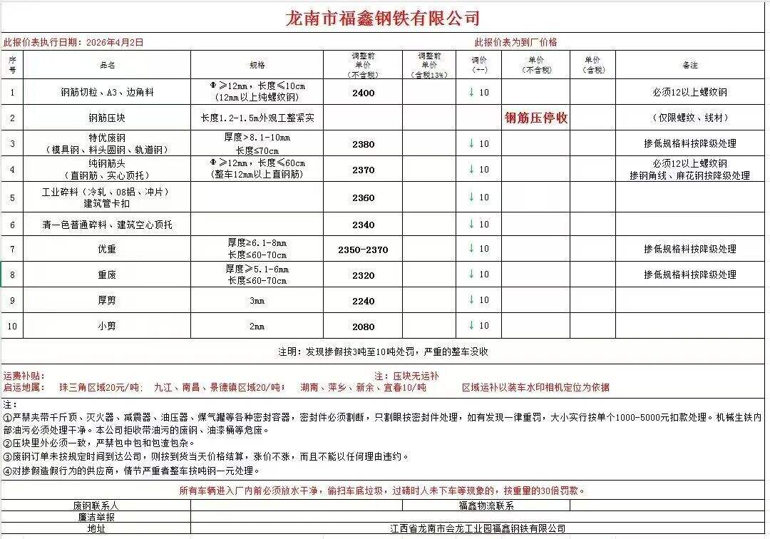 龙南市福鑫钢铁有限公司废钢报价表