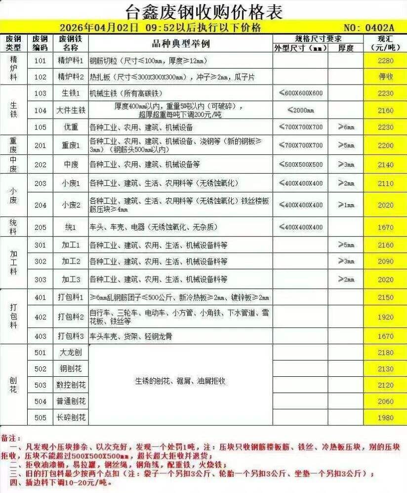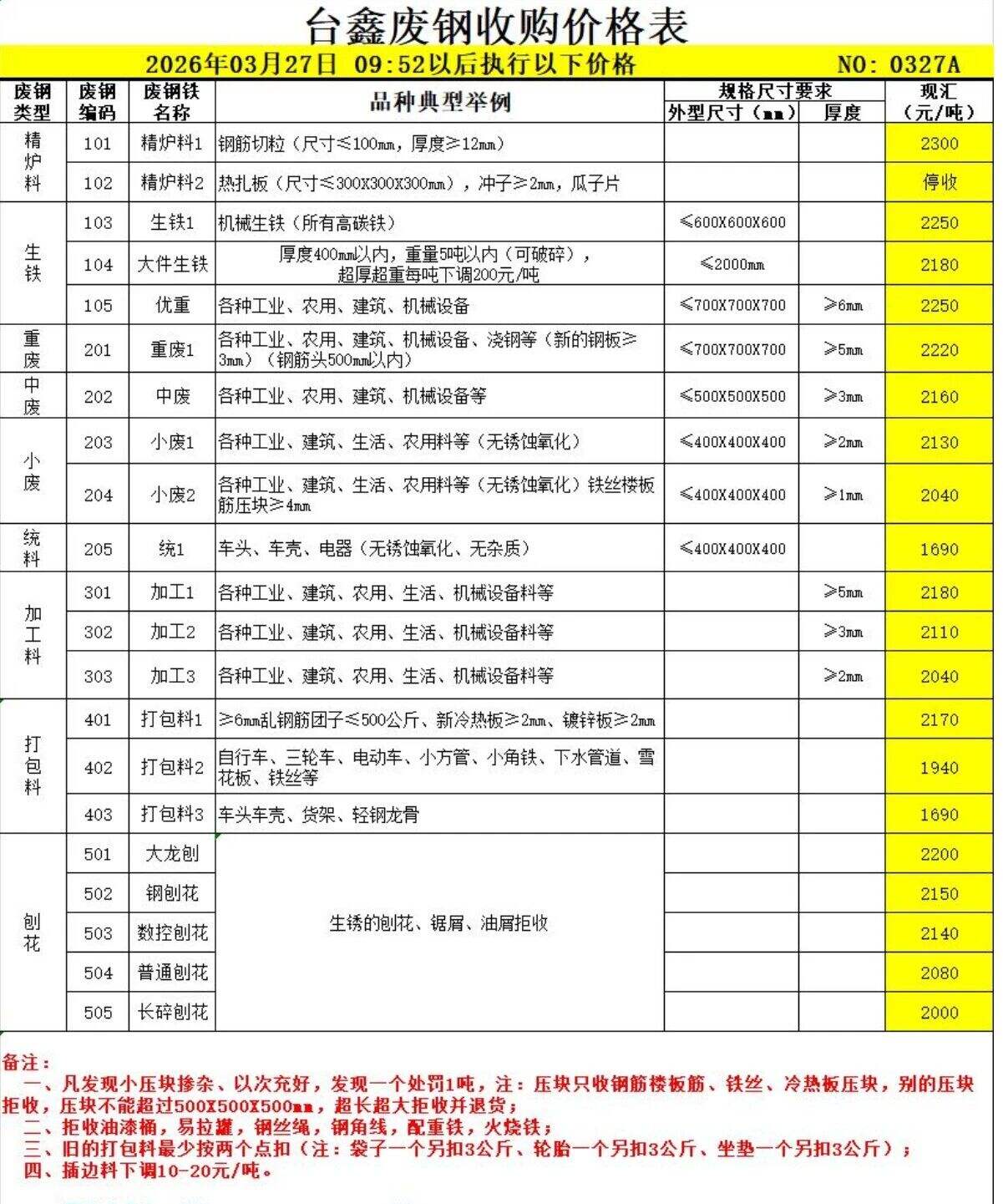 * 特优废钢(模具钢、料头圆钢、轨道钢) 规格:厚度>*.*-**mm,长度≤**cm 单价:**** 备注:掺低规格料按降级处理