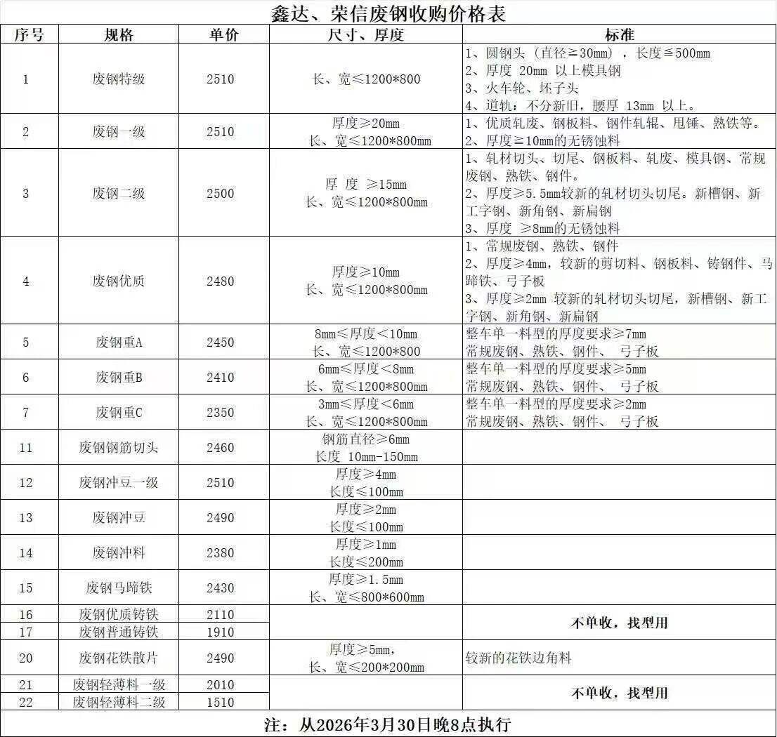 鑫达荣信废钢于*月**日晚*点进行价格调整,废钢价格下调**