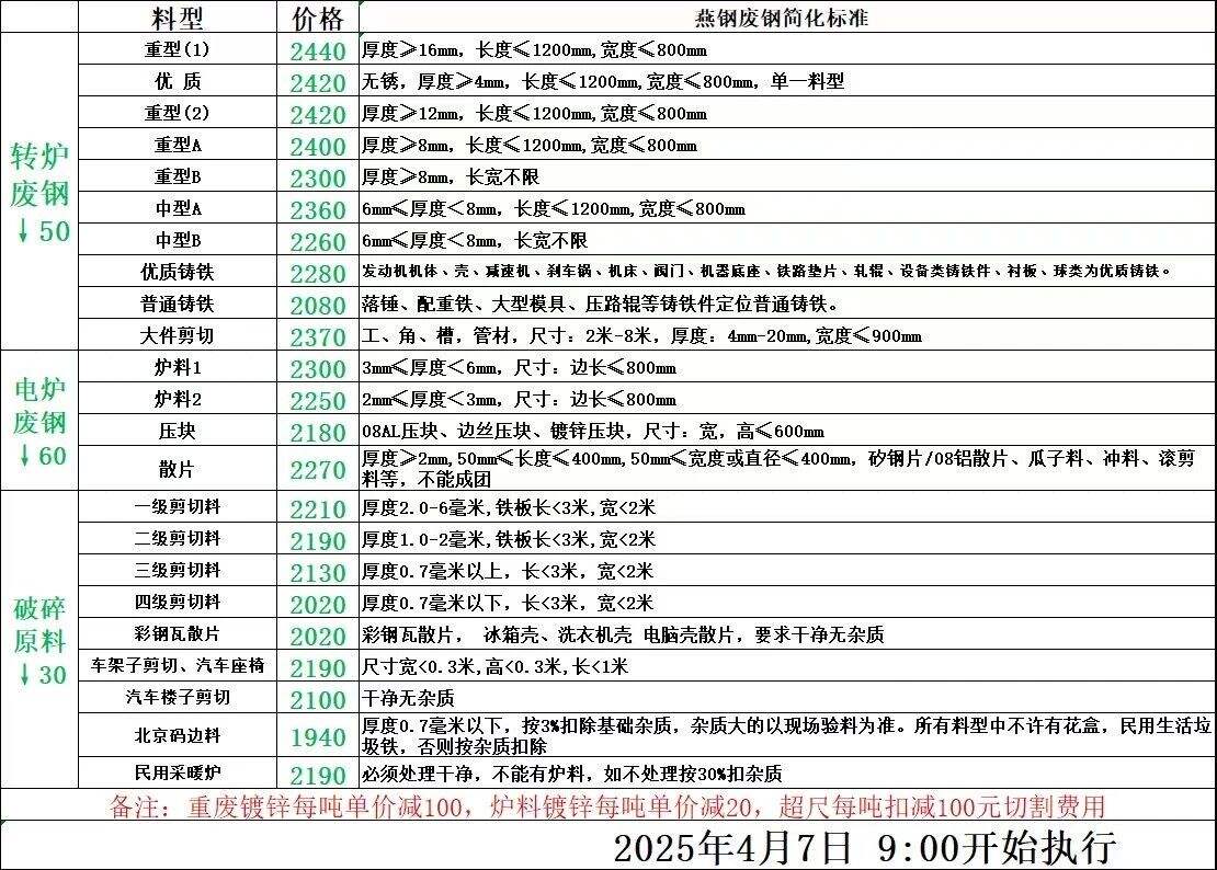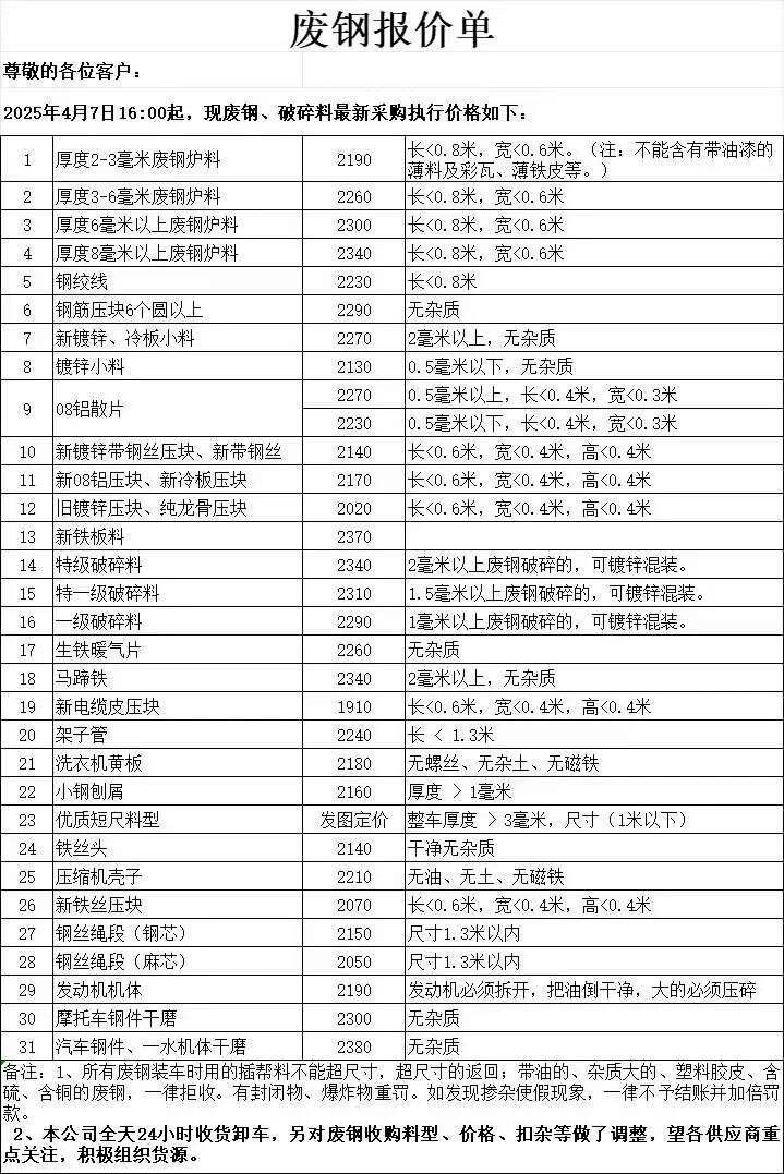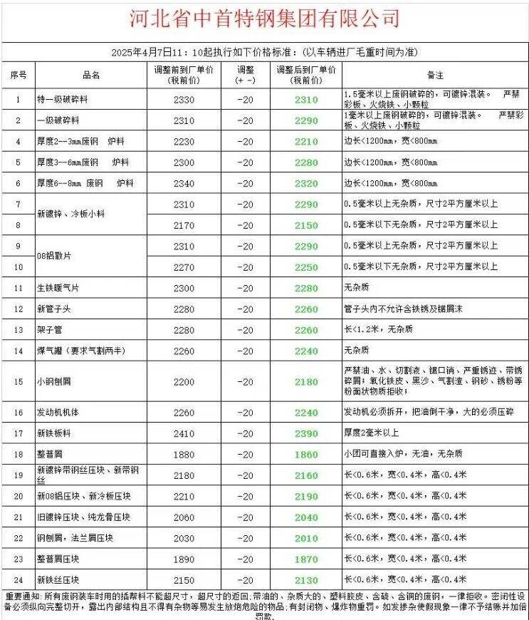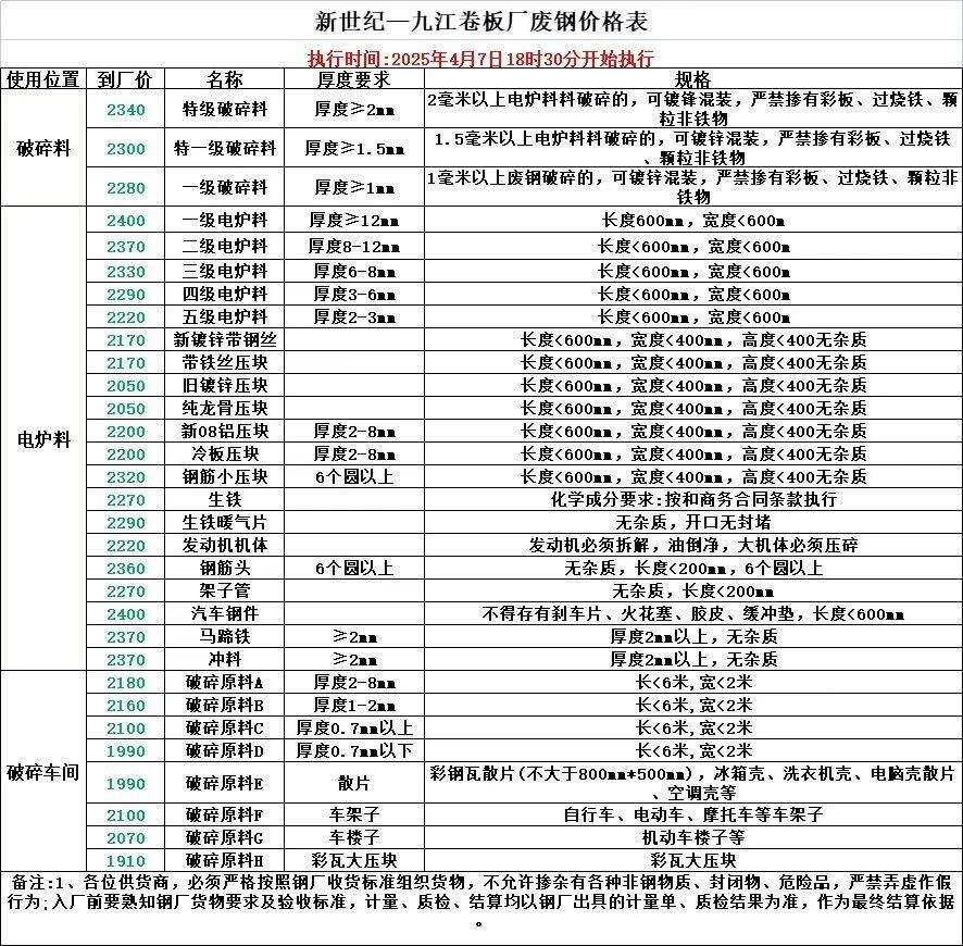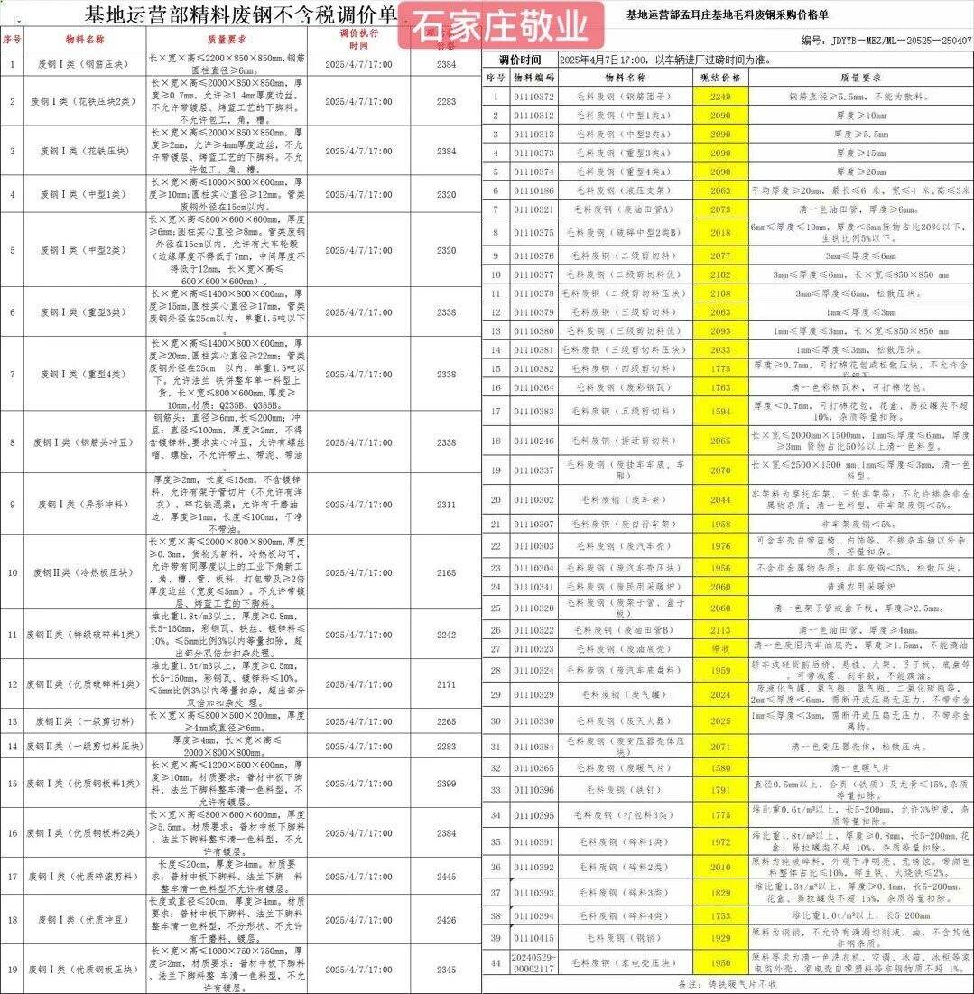 敬业通知,*月*日**点起本部废钢价格调整,具体详见价格表