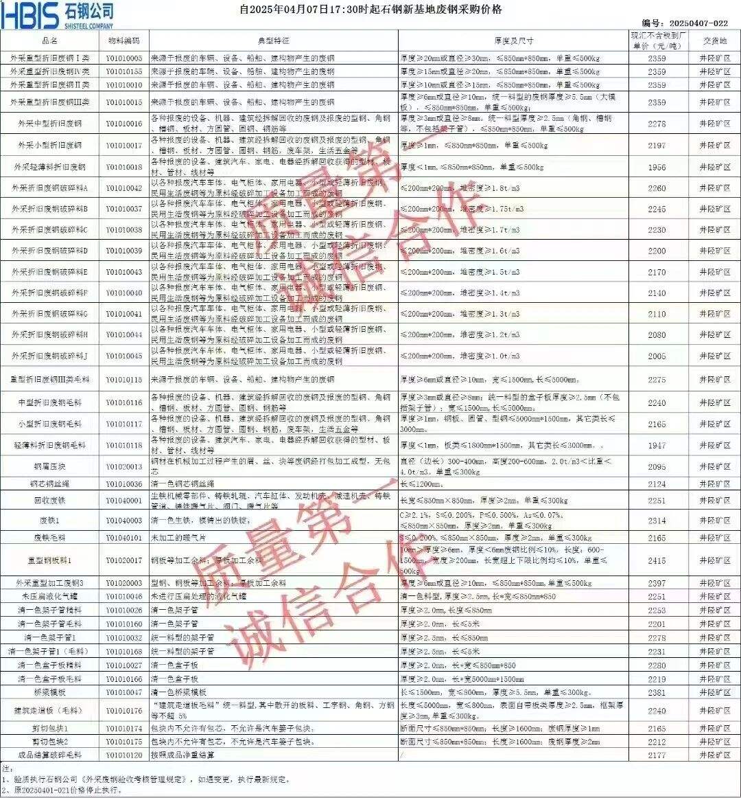 河北中首特钢****年*月*日**:**起废钢价格下调**以车辆进厂毛重磅单时间为准。,特一级破碎料****一级破碎料****,*-*炉料****,*-*炉料****,新镀锌冷板小料****-****,**铝散片****-****生铁暖气片****,,*日唐山中首特钢废钢采购执行价跌**,特一级破碎料****一级破碎料****,*-*炉料****,*-*炉料****,新镀锌冷板小料****-****,**铝散片****-****生铁暖气片****,