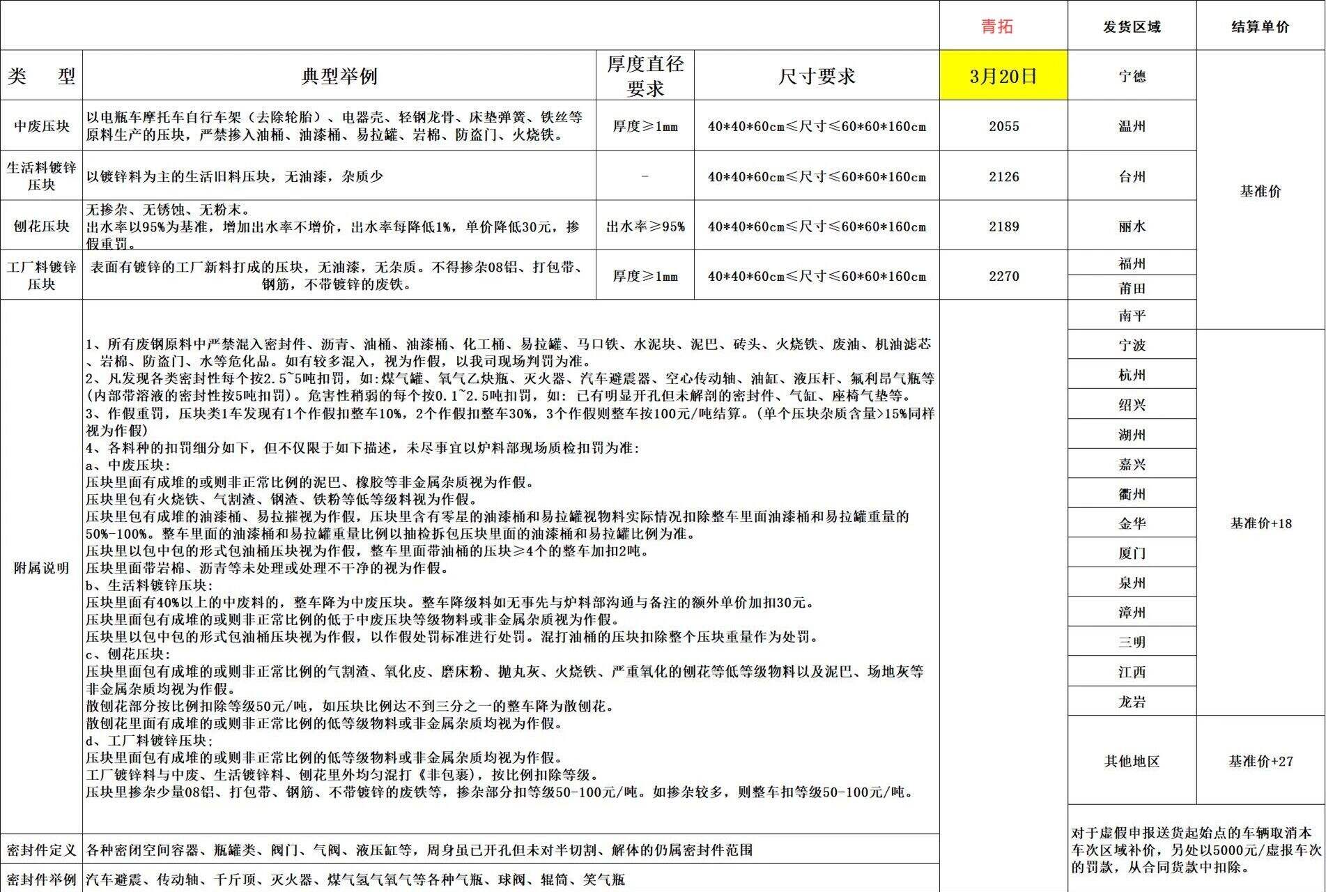 泉州闽光:****年*月*日**时起,省内外钢筋压块、工业压块、打包压块含税上调**元/吨,其它等级废钢含税上调**元/吨,具体详见价格表。