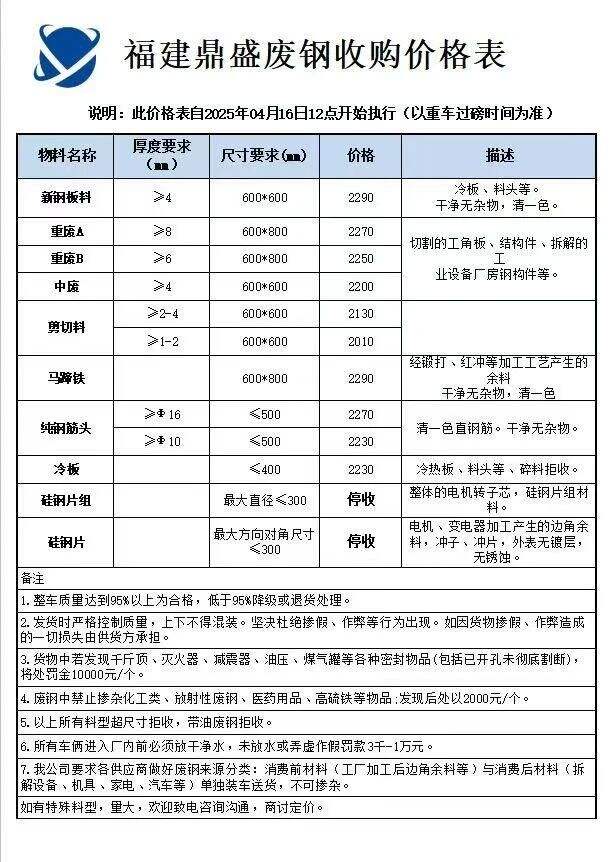 **日福建鼎盛最新价跌**,新钢板料****,重A****,重B****,中废****,剪切料****-****,马蹄铁****,纯钢筋头****-****,冷板****,矽钢片组停收,矽钢片停收