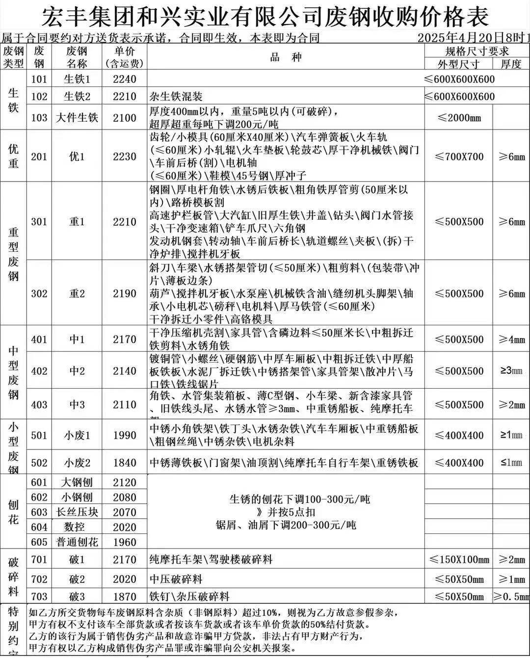 顺昌宏丰通知,三次调价废钢刨花破碎料等所有品种统一下调**元/吨,现在起执行,三次**日顺昌宏丰最新,生铁****-****、大件生铁****、优重****、重废****-****、中废****-****、小废****-****、大钢刨****、数控/压块****、普刨****、破碎料****-****