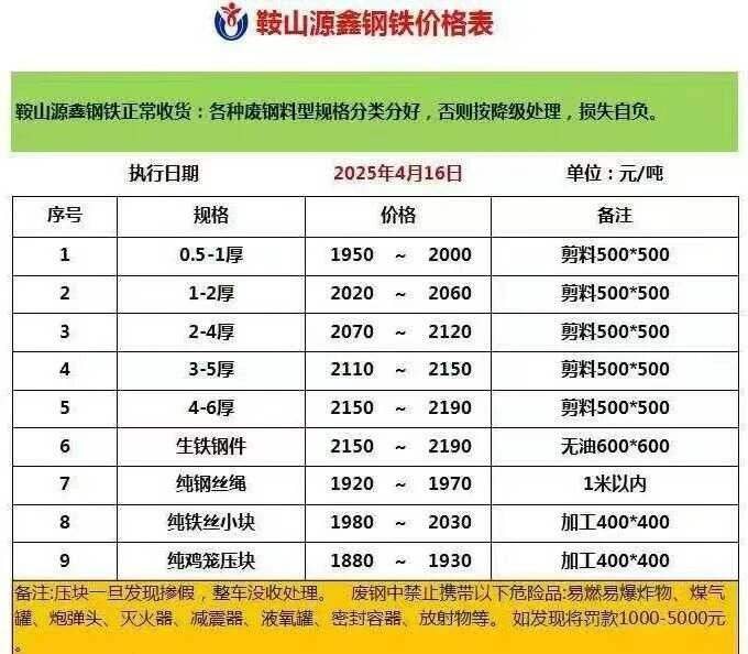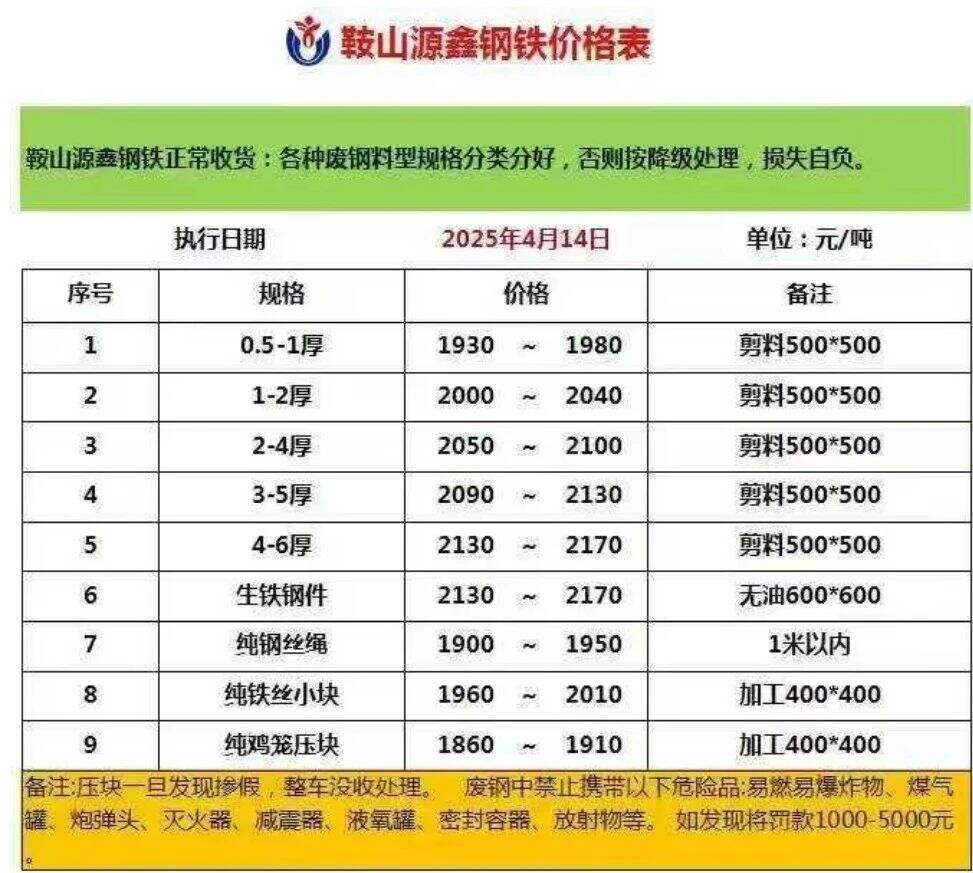 *月**日鞍山源鑫废钢上调**,*.*~*厚****~****,*~*厚****~****,*~*厚****~****,*~*厚以上****~****,*~*厚****~****,生铁钢件****~****,不含税。