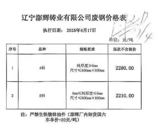 *月**日辽宁新澎辉废钢上调**,:A料****、B料****,不含税。