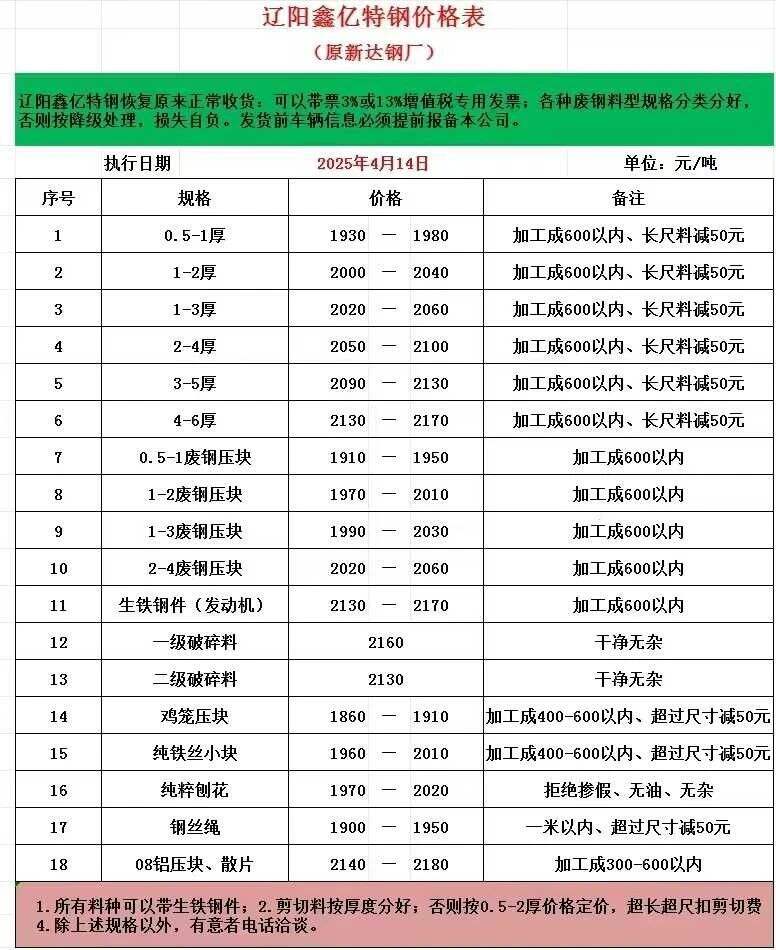 *月**日辽宁鑫亿废钢价格个别下调**,:*.*-*厚****-****、*-*厚****-****,*-*厚****-****、*-*厚****-****,*-*厚****-****,*-*厚以上****-****,生铁钢件****-****,刨花****-****,不含税。