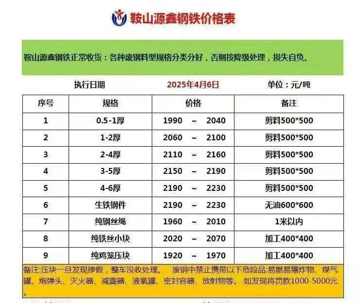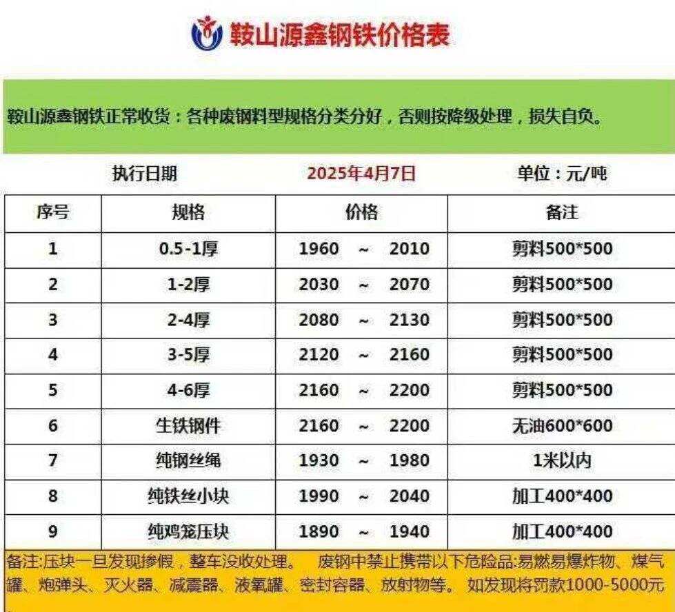鞍山源鑫废钢价格跌**,*.*-*厚****~****,*-*厚****~****,*-*厚****~****,*-*厚****~****,*-*厚****~****,生铁钢件****~****,纯钢丝绳****~****,纯铁丝小块****~****,纯鸡笼压块****~****.